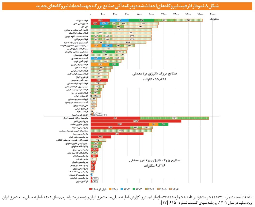 بر اساس گزارش مرکز پژوهشهای مجلس، مجموع ظرفیت نیروگاهی احداث شده تاکنون و برنامهریزی شده تا سالهای آتی، حدود ۲۵,۲۱۷ مگاوات است. منظور از برنامهریزیشده این است که جهت احداث نیروگاه، اخذ مجوز، اختصاص ساختگاه، عقد قرارداد با پیمانکار، تأمین مالی یا اقداماتی نظیر این موارد انجام شده است. از این میزان حدود ۱۵,۸۹۱ مگاوات مربوط به صنایع بزرگ معدنی بوده و ۹,۳۲۶ مگاوات مربوط به صنایع بزرگ غیرمعدنی است. ظرفیت نیروگاههای صنایع بزرگ که تا اسفند ماه سال ۱۴۰۳ به بهرهبرداری از نخستین واحد رسیدهاند، ۹,۴۲۲ مگاوات بوده که از این میزان حدود ۳,۴۶۵ مگاوات مربوط به صنایع بزرگ معدنی بوده و حدود ۵,۹۵۷ مگاوات مربوط به صنایع بزرگ غیرمعدنی نظیر صنایع پتروشیمی و پالایشگاهی میباشد. از کل نیروگاههای صنایع بزرگ کشور، حدود ۶,۸۶۴ مگاوات، مربوط به قبل از تصویب قانون مذکور بوده و عمدتاً نیروگاههای دهه هشتاد و قبل از آن است. بنابراین کل ظرفیت نامی نیروگاههای احداث شده توسط صنایع بزرگ، از زمان تصویب قانون تا اسفندماه ،۱۴۰۳ معادل ۲،۵۵۶ مگاوات است. همانطور که در شکل زیر نشان داده شده، با احتساب طرحهای توسعه نیروگاهی، شرکت فولاد مبارکه و پس از آن به ترتیب شرکت ملی مس و شرکت گل گهر بیشترین سهم را در احداث نیروگاههای صنایع بزرگ معدنی دارند. در بخش صنایع بزرگ غیرمعدنی، شرکت مایعسازی گاز طبیعی ایران (ایران LNG )و پس از آن به ترتیب پتروشیمی فجر و پارس جنوبی یبشترین سهم را در توسعه نیروگاههای صنایع بزرگ کشور ایفا کردهاند. ارقام ارائه شده در این شکل تا سال ۱۴۰۳ واقعی و پس از آن، پیشبینی شده هستند